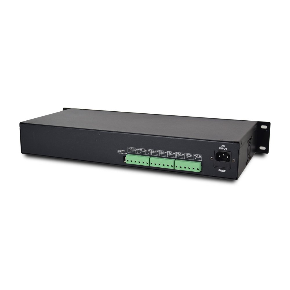 Розподільний блок живлення на 9 виходів. Вхідна напруга 190-240 В AC, 50/60 Гц, вихідна напруга DC 12-14 В/10А. Запобіжник (PTC), що самовідновлюється. Підходить під стійку 19″. Габаритні розміри: 440 х 225 х 67 мм.