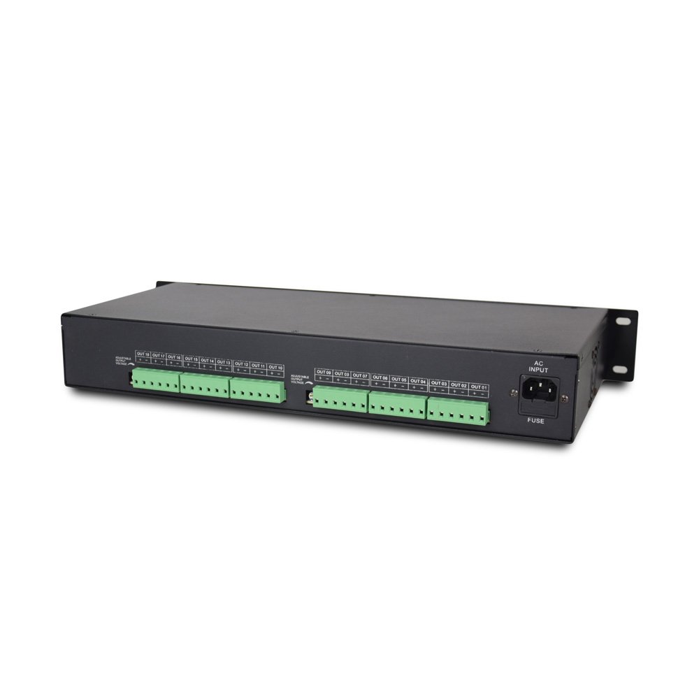Розподільний блок живлення на 18 виходів. Вхідна напруга 190-240 В AC, 50/60 Гц, вихідна напруга DC 12-14 В/20А. Запобіжник (PTC), що самовідновлюється. Підходить під стійку 19″. Габаритні розміри: 440 х 225 х 67 мм. Кабель в комплектацию не входит.