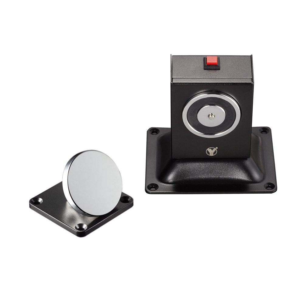Фіксатор дверей настінного або підлогового кріплення з кнопкою скасування фіксації дверей. Стандартний тип кріплення. Для димозахисних дверей. Низьке споживання, не намагнічується. Сила утримання 180кг, Живлення 12V DC/240mA l 24V DC 120mA, Габаритні розміри 90 x 90 x 128 мм.
