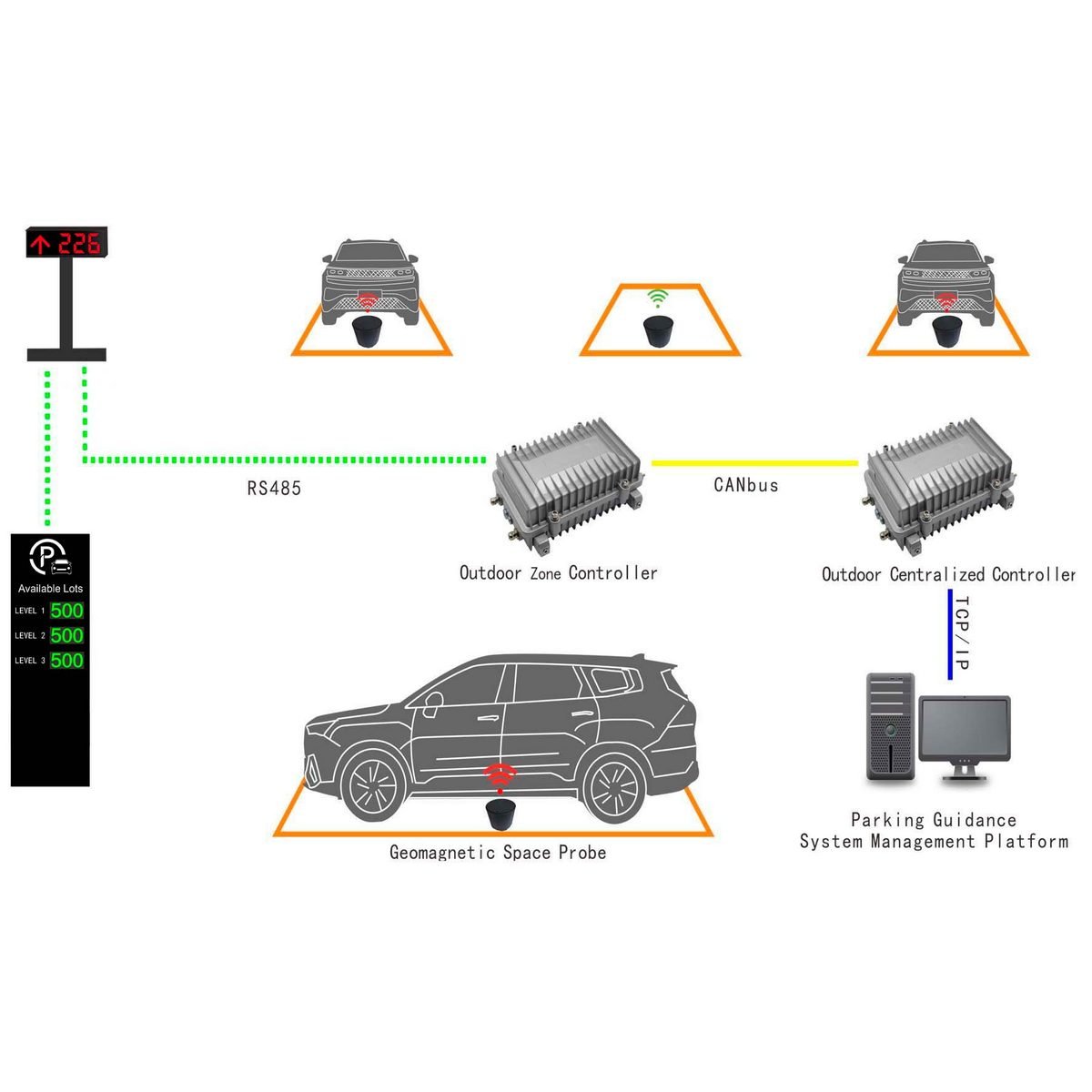 Вбудований бездротовий паркувальний датчик. Встановлюється у дорожнє покриття. Точність детекції: ≥99%. Тип зв’язку: RF 470 МГц @ 10 кбіт/с. Дальність передачі: до 100 м. Живлення: вбудований акумулятор 38000 мА·год. Середній струм споживання: до 50 мкА. Термін служби батареї: понад 5 років. Робоча температура: -30~+85°C. Ступінь захисту: IP68. Витримує тиск до 20 тонн. Розміри: Ø113×101 мм. Вага: 850 г. Підтримує бездротове налаштування та оновлення через мобільний додаток.