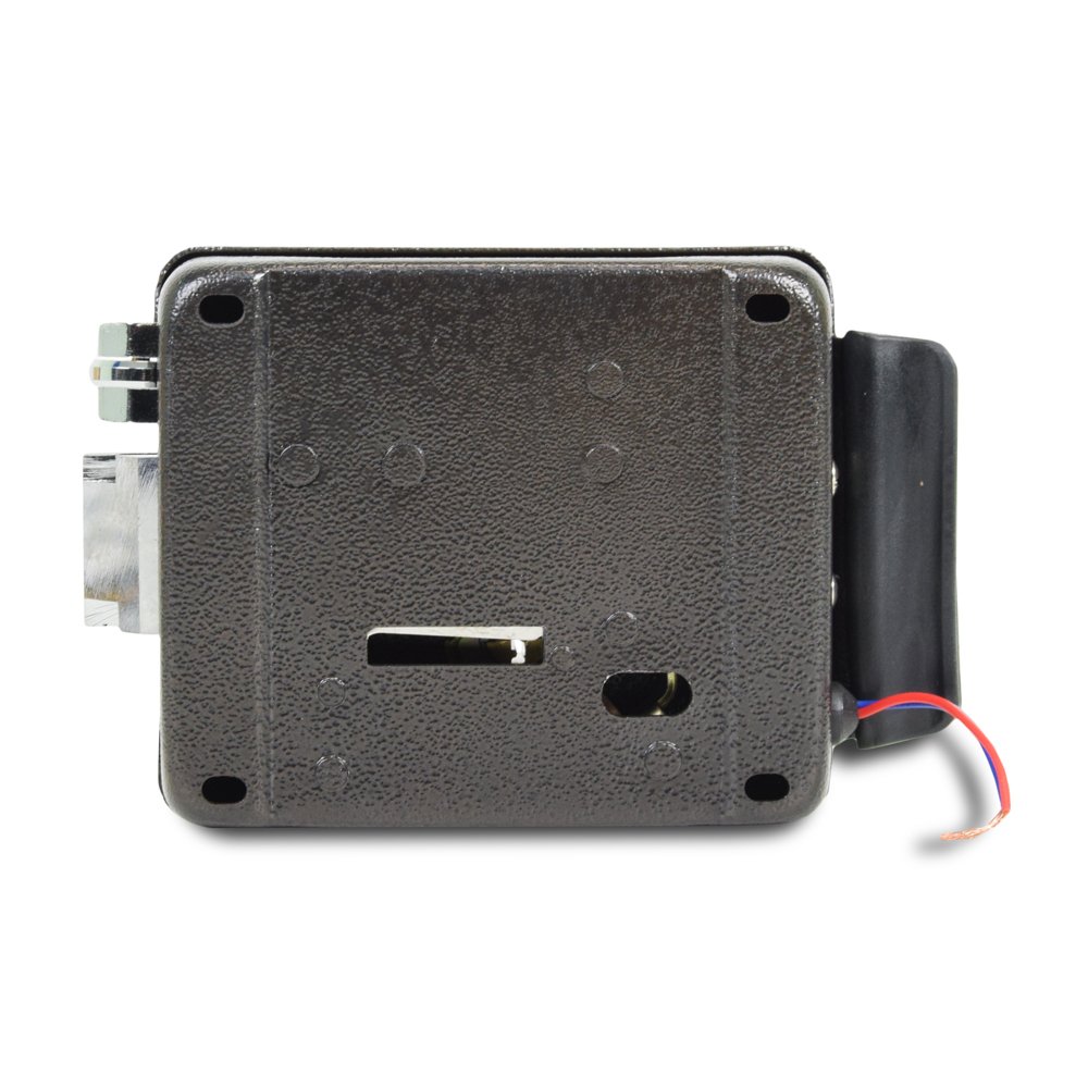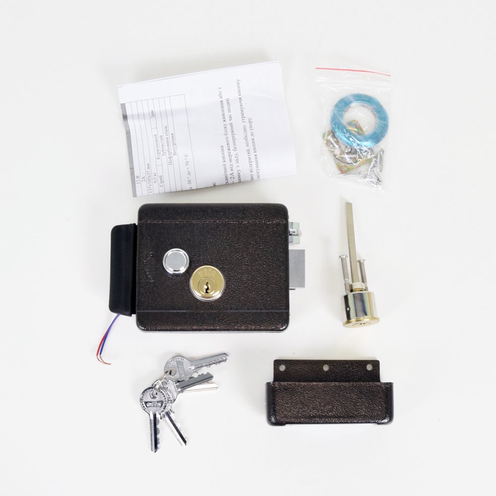 Електромеханічний замок, накладний, встановлення внутрішнє, ліве / праве, пофарбований метал, кнопка виходу на замку, тип ключа – зубчастий, 12В / 2А, колір коричневий. Розміри: 160х105х37+10 кнопка – з висунутим язичком; 137х105х37 – без язичка