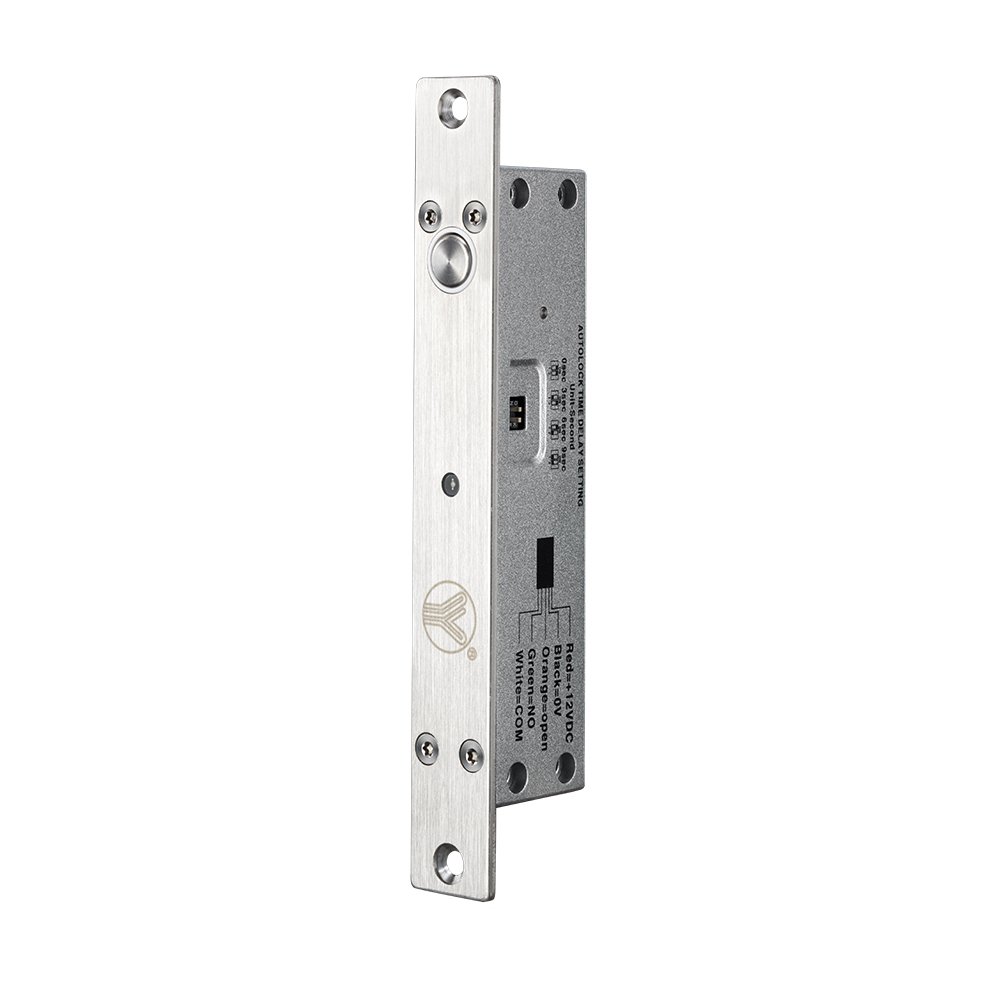 Накладний електроригельний замок для вузьких дверей. Без живлення відімкнений. Вбудований індикатор стану дверей і таймер затримки зачинення дверей: 0,3,6 і 9 сек. Максимальна відстань спрацювання 8мм. Робочий струм: 1000мА, в режимі очікування: 180мА. Живлення 12В. Розміри 267х45х38мм.