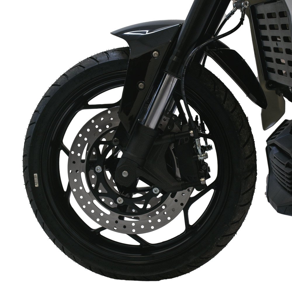 Електроскутер оснащений колесами з оптимальними параметрами для стійкості та комфорту: переднє колесо 110/70-17, а заднє — 200/55-17. Така конфігурація забезпечує стійкість і надійне зчеплення з дорогою за будь-яких умов. Максимальна швидкість досягає 110 км/год, що робить його чудовим вибором для тих, хто цінує швидкість і мобільність.