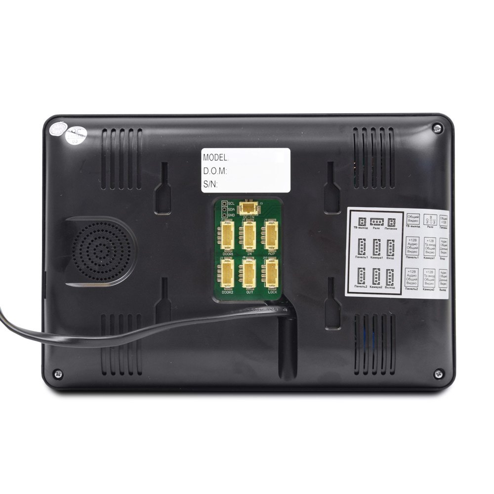 Комплект: відеодомофон і відеопанель. Кольоровий домофон з TFT екраном 7 дюймів і сенсорними кнопками керування, підключення 2 панелей виклику. Розмова по гучному зв’язку, є інтерком. З’єднання з панеллю виклику 4-дротове. Живлення 100-240V, споживання 8 Вт. Корпус домофона чорного кольору. Кольорова панель виклику чорного кольору з роздільною здатністю 1000ТВЛ і кутом огляду 110°, з накладним способом монтажу