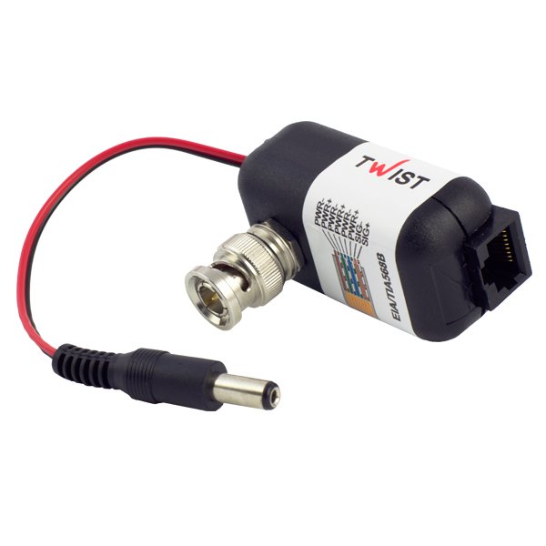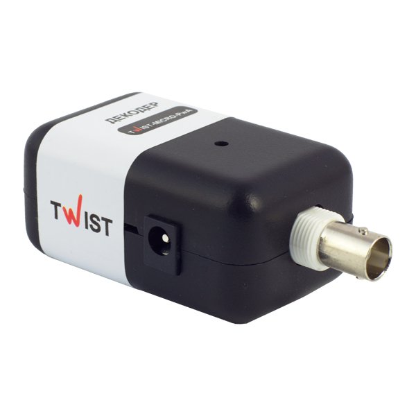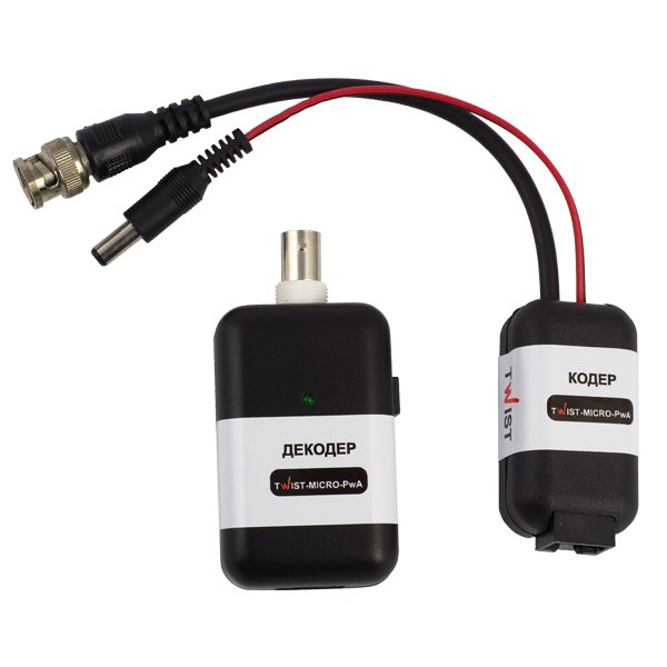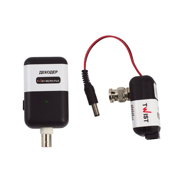 Одноканальний комплект підсилювачів для передачі відеосигналу і живлення відеокамер Twist-MICRO-PwA використовує технологію PwA для передачі чорно-білих або кольорових відеосигналів та живлення відеокамер (12 В / 0.5 А) по кабелю звитої пари UTP, FTP, SFTP, ТППЕП і аналогічного на відстань до 100 м. Живлення комплекту (адаптер 15 в, 0.8 А DC в комплекті): ~ 220 в (+/- 10%), 50 Гц. Захист від імпульсних перешкод до 600 В (тривалість ~ 8 мс). Габаритні розміри: кодер TWIST-PwA-MICRO TX – 50 x 42 x 31 мм; декодер TWIST-PwA-MICRO RX – 79 x 42 x 32 мм.