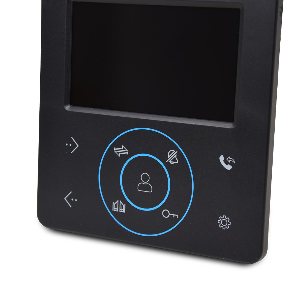 Кольоровий домофон з TFT екраном 4 дюйми і сенсорними кнопками керування, підключення 2 панелей виклику. Розмова по гучному зв’язку, є інтерком. З’єднання з панеллю виклику 4-дротове. Живлення 100-240V, споживання 8Вт. Корпус чорного кольору.