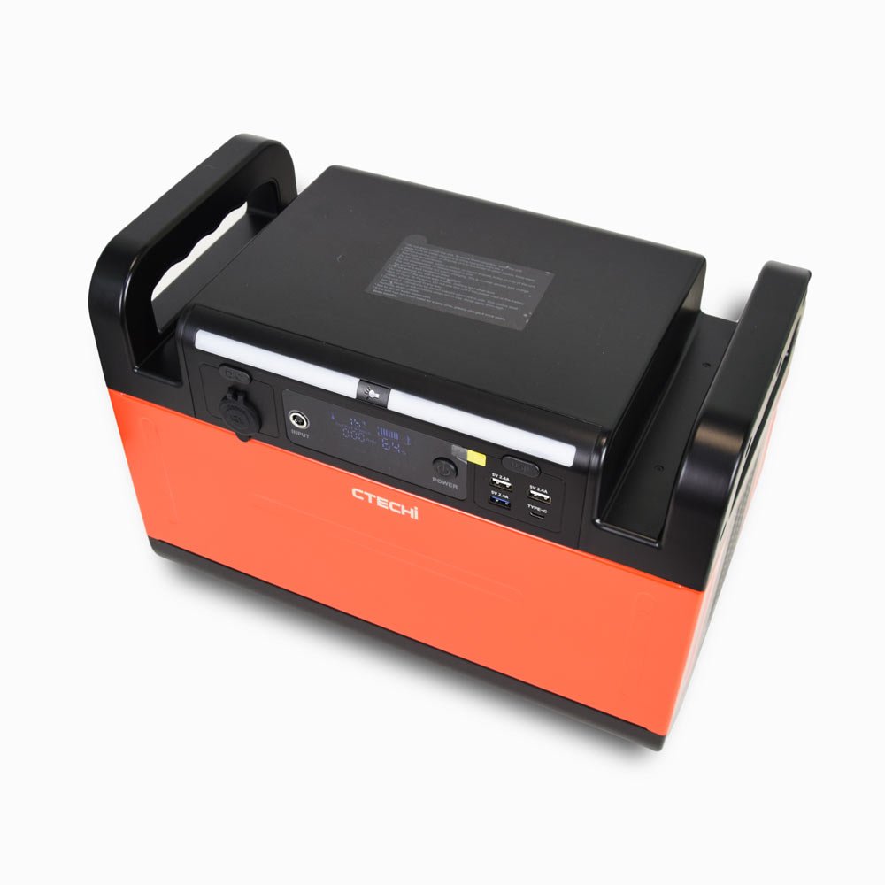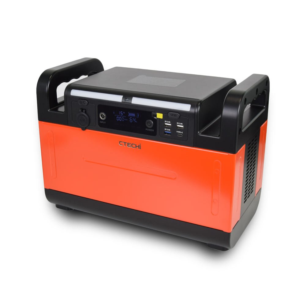 Зарядна станція CTECHi GT1200 Portable Power Station – це портативна акумуляторна електростанція потужністю 1200Вт / 1008Вт·ч з літій-залізофосфатною батареєю LiFePO4. Станція має 2 євро-розетки (чистої синусоїдальної напруги) змінного струму, 1 вихідний DC порт, 3 порти USB-A, 1 порт TYPE-C. Одночасно може подавати електроживлення на 7 пристроїв. Час повної зарядки електростанції приблизно 6 годин. При нормальній роботі, без навантаження, з малим навантаженням шум менше 30 дБ. Після включення вентилятора шум менше ніж 70 дБ. Зарядна станція підходить для кемпінгу, подорожей, відпочинку на природі, надзвичайних ситуацій, а також незамінна при віялових відключеннях електрики у квартирах чи приватних будинках.